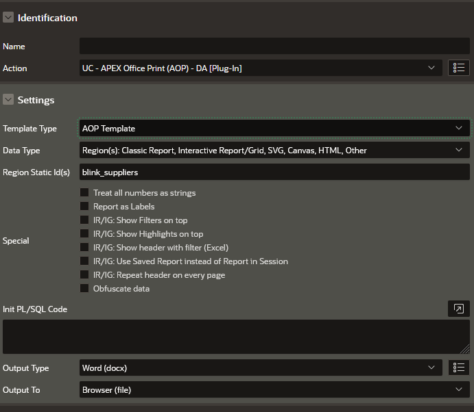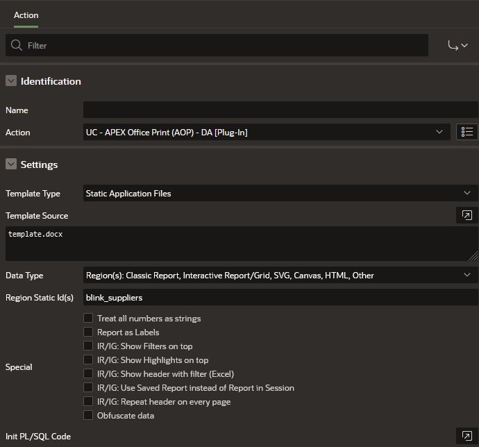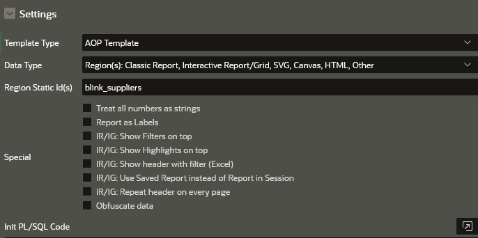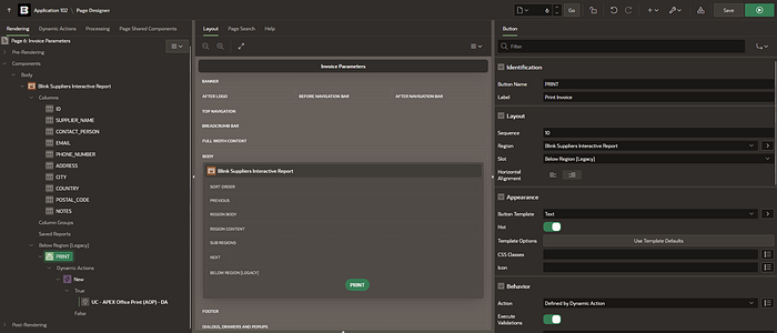 • Example: If you are printing a Classic Report based on the data displayed on the page, you would enter the Static ID of the report region (e.g., blink_suppliers as seen in the first screenshot).
