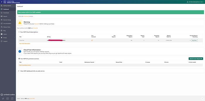 Before you begin integrating AOP into Oracle APEX, the first step is to create an account on the APEX Office Print website. Once registered, you’ll be able to access your user dashboard. This is where you will find key information like your API Key, which is necessary for connecting AOP to your APEX environment.