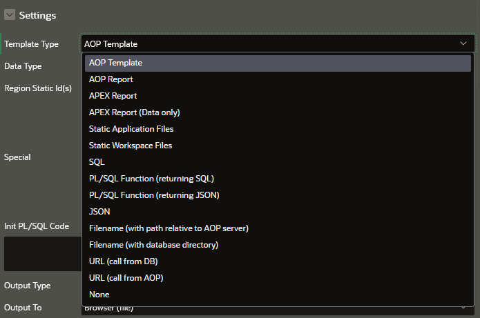 • AOP Template: Select this option if you want to use a template stored within AOP. This is the most common use case where a .docx, .xlsx, or .pdf template is stored and used to format your data dynamically.