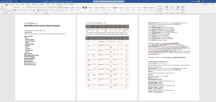 In this APEX Office Print (AOP) Custom Word Template, two different approaches are being used to display data: one table is generated using a placeholder for an Interactive Report, and the other uses loop tags to display data dynamically.